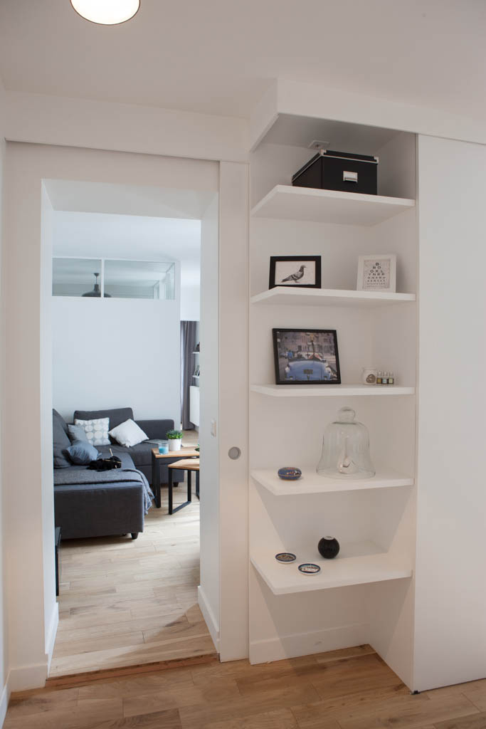 Ce chantier a été réalisé pour un jeune couple enthousiaste et exigeant. L’appartement de 40 m2 était dans un état assez calamiteux. Nous l’avons visité ensemble entièrement encombré de meubles lourds, des murs peints couleur saumon, un parquet des années 60, une cuisine désuète avec une tuyauterie eau et gaz qui formait des vrais spaghettis dans tous les sens. Une chambre et une salle de bain disproportionnées par rapport au séjour et quelques gros murs porteurs dont nous avons bien nous accommoder…Mais loin de nous décourager, ses 5 fenêtres sur cour et sa belle hauteur sous plafond de 2m60 nous invitaient à la créativité pour révéler ses airs de future petite maison…