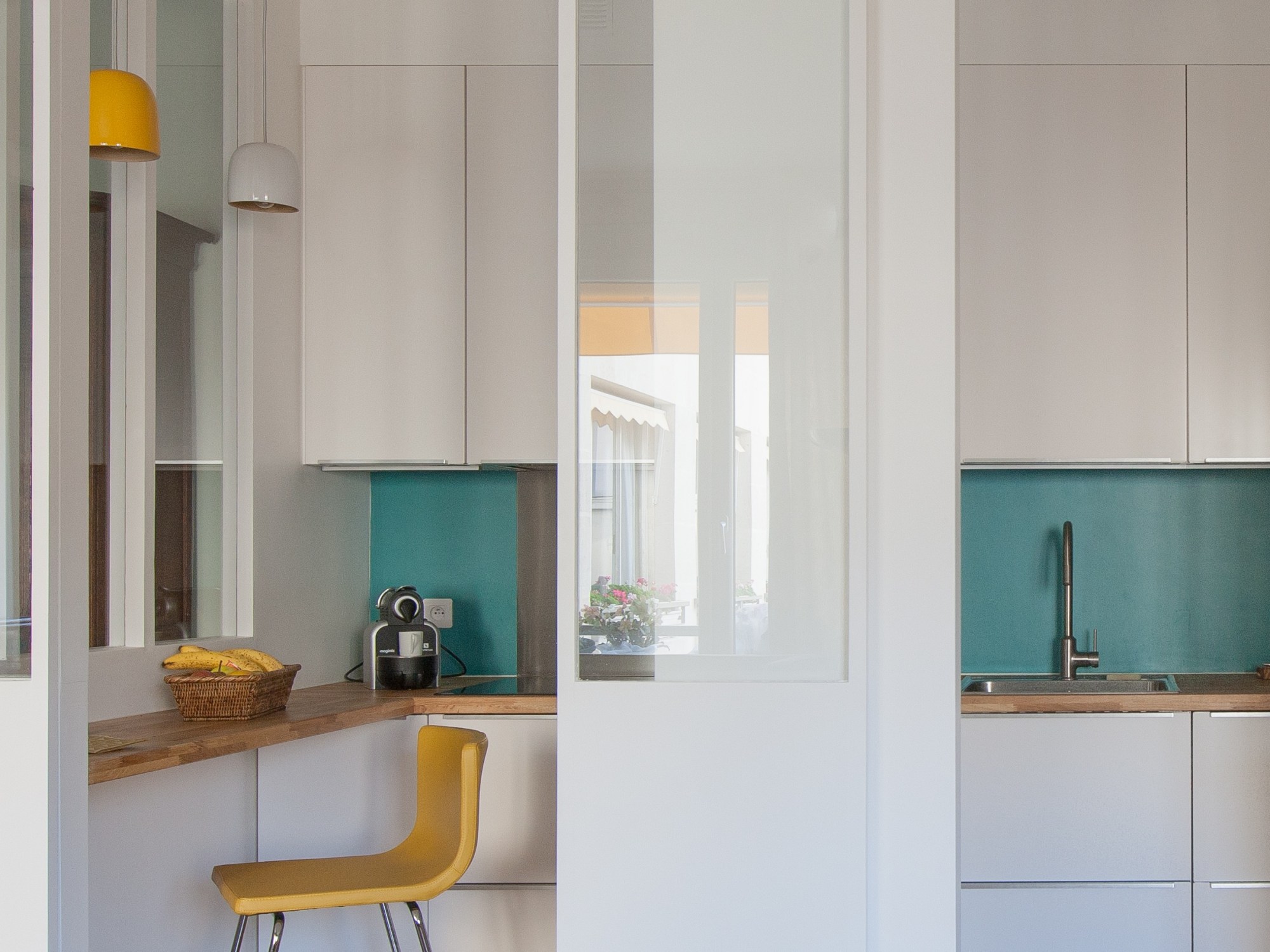 Spacieuse, la nouvelle cuisine bénéficie d’une très belle surface de travail (plan en chêne massif) et d’un espace pour déjeuner. La crédence a été peinte en Intelligent Shell Canton de Little Green, les éléments hauts et bas ont été choisi blanc mat, les luminaires blanc et jaune en bambou laqué ont été trouvés chez SUMMER CAMP, le tabouret en cuir jaune vient de chez IKEA. La suspension du couloir vient de FLEUX.