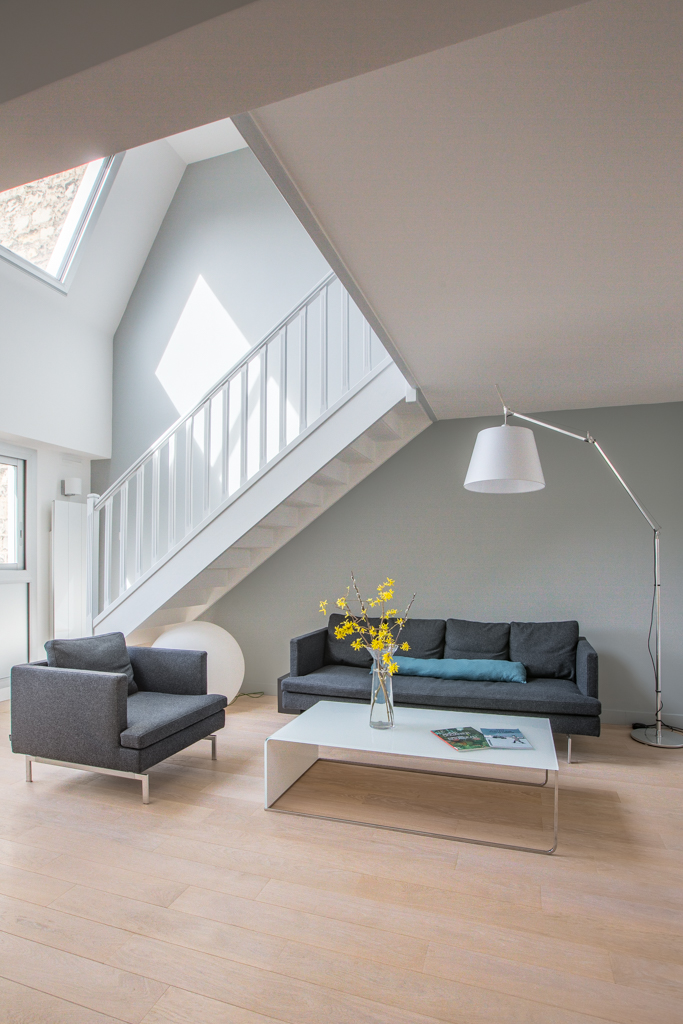 Le choix du parquet pour l’ensemble de l’appartement a été murement pesé, c’est chez Emois et Bois que le parquet en chêne légèrement blanchi avec de larges lames et sans noeuds apparents a été choisi. Il introduit une belle douceur qui vient contrebalancer le mobilier aux lignes épurées et la lumière plongeante dont bénéficie cet appartement sous les toits flatte toutes ses nuances.