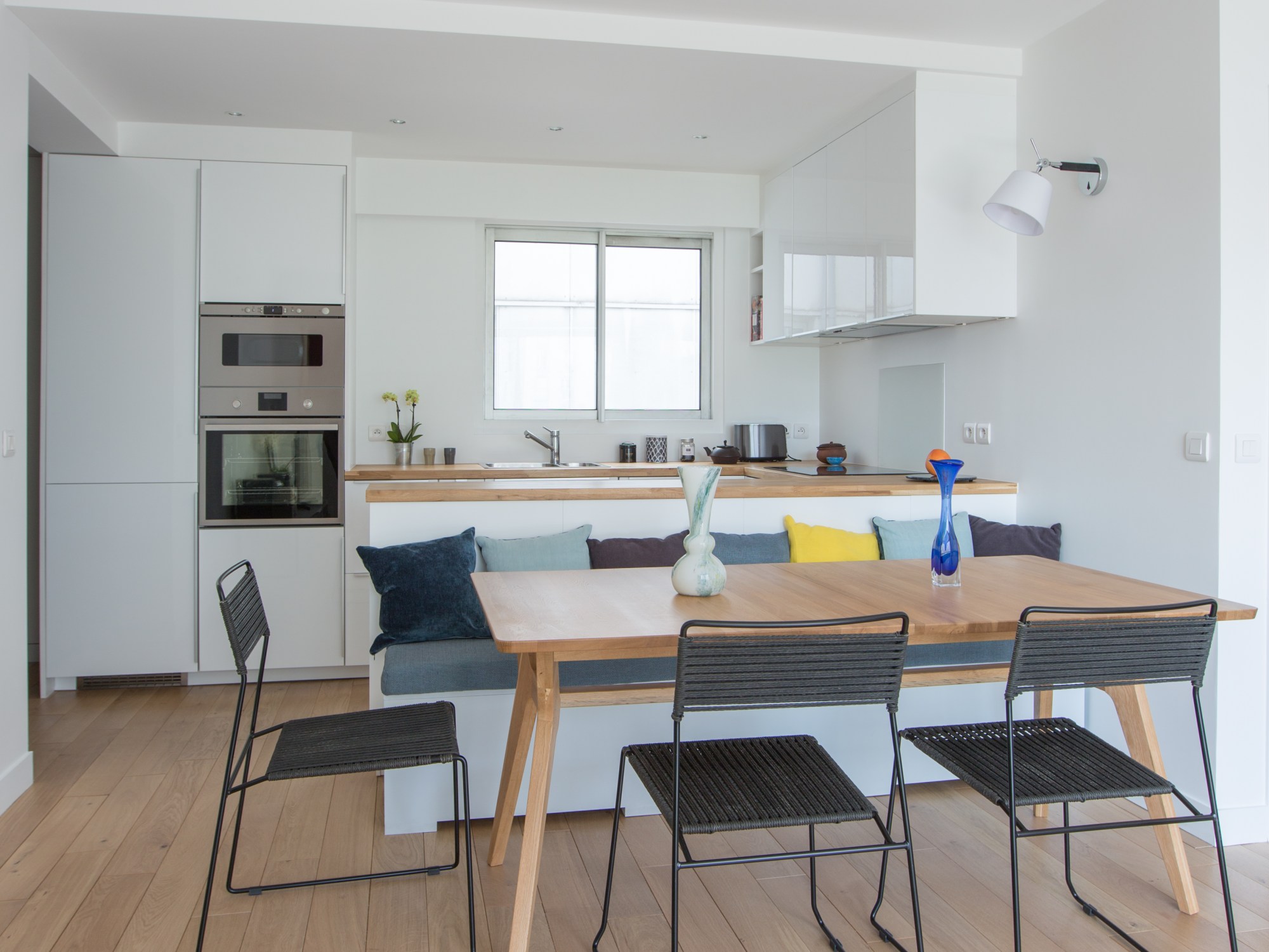 Suite aux transformations effectuées, l’espace cuisine bénéficie d’une double exposition et la vue dégagée côté terrasse. Le choix des façades laquées blanc réchauffées d’un plan de chêne laissent la vedette à la lumière et aux touches de couleur apportées par les coussins et la banquette: mixant velours et lin de Designer Guild (réalisation Atelier Syb). Une petite niche pour ranger les livres de recettes a été aménagée.